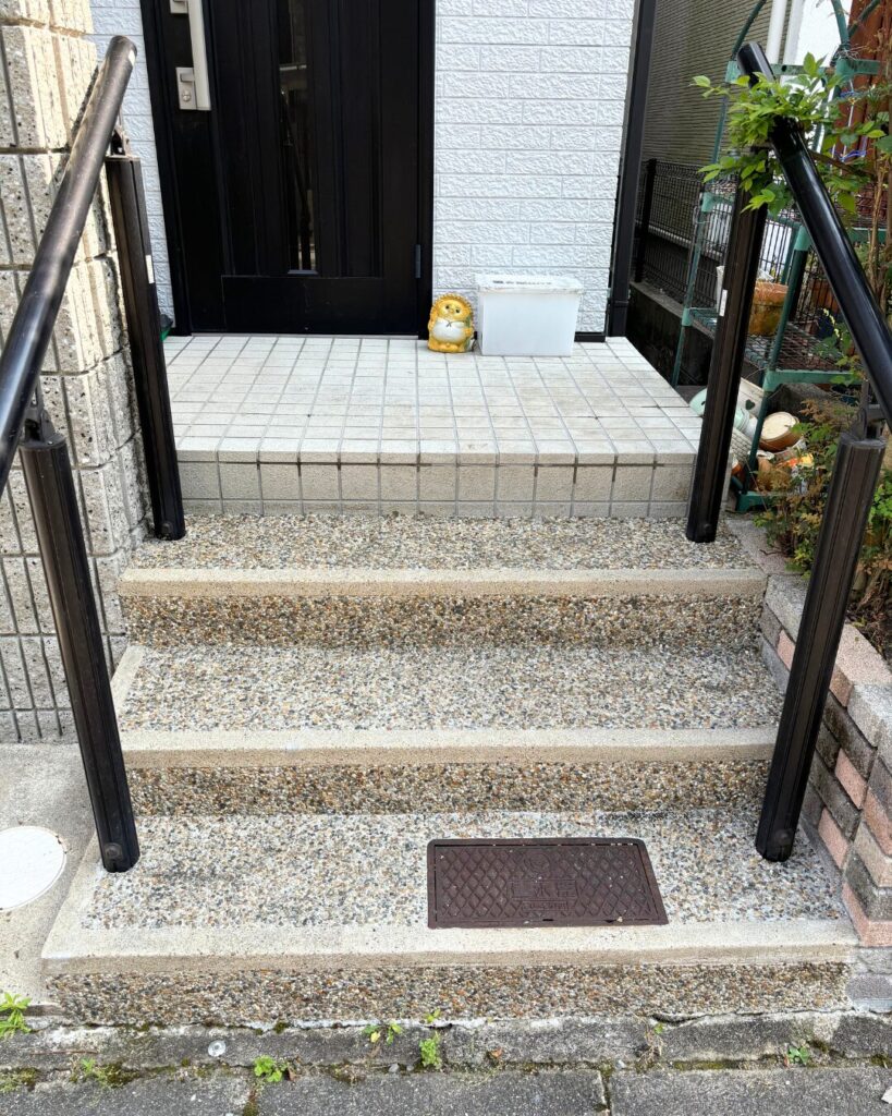 築年数が経つにつれ、郵便ポストが埋め込まれている「門柱」や、玄関へ続く「階段」に、縦に伸びる黒い筋(雨だれ)が目立つようになっていました。